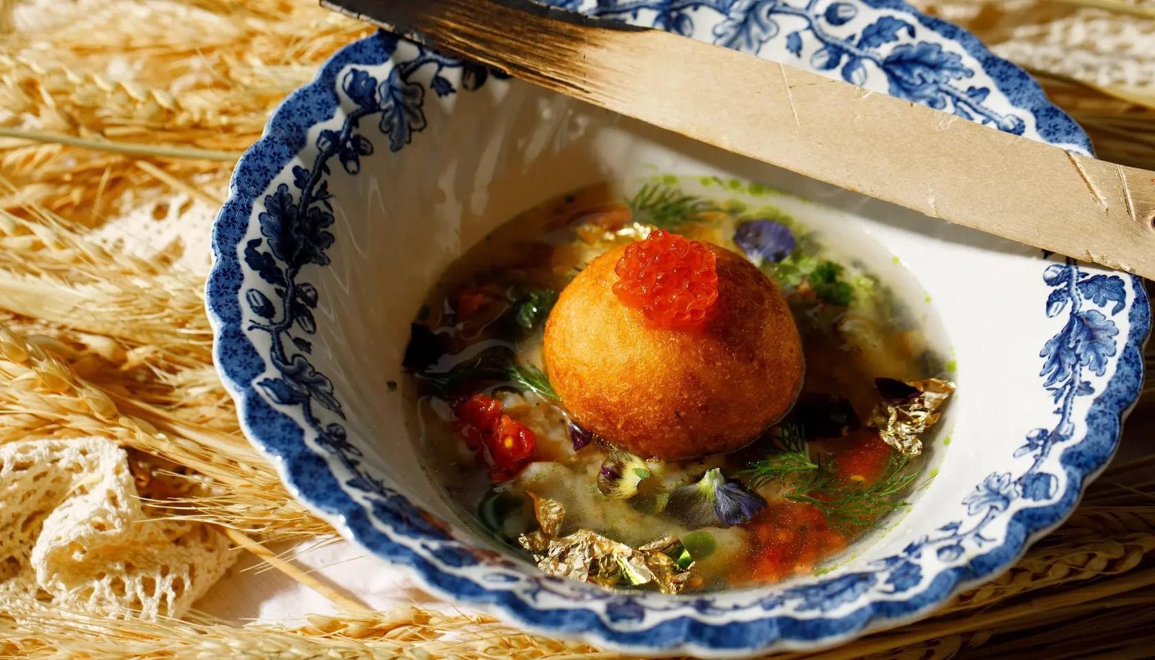 Русская уха с луковым пончиком